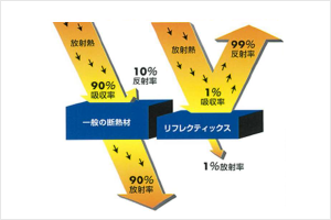 ⾼遮熱材「リフレクティック ス」はわずか8㎜の薄さで太陽 の放射熱の99%を反射し、⼀